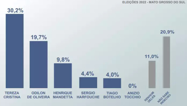 Odilon de Oliveira (PSD) ocupa a segunda posição, com 19,7% das intenções de voto, enquanto Luiz Henrique Mandetta (União) tem a simpatia de 9,8% do eleitorado, conforme a amostragem.
