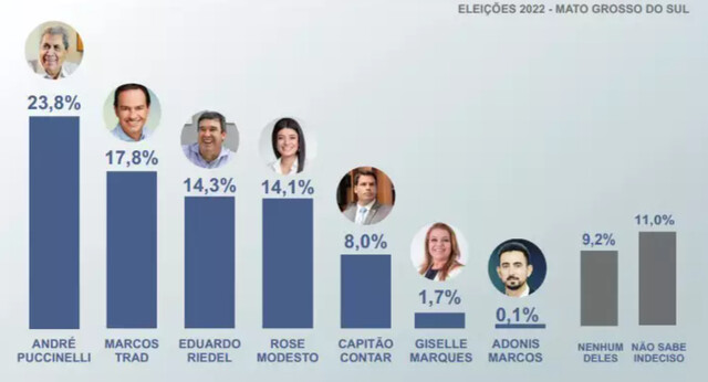 Pesquisa do Instituto Novo Ibrape manteve a mesma configuração do levantamento anterior, trazendo André Puccinelli (MDB) em primeiro lugar nas intenções de votos para governador de Mato Grosso do Sul, Marquinhos Trad (PSD) em segundo, Eduardo Riedel (PSDB) na terceira posição e Rose Modesto (União) na quarta. Dos quatro, contudo, Trad foi o único que perdeu eleitores.