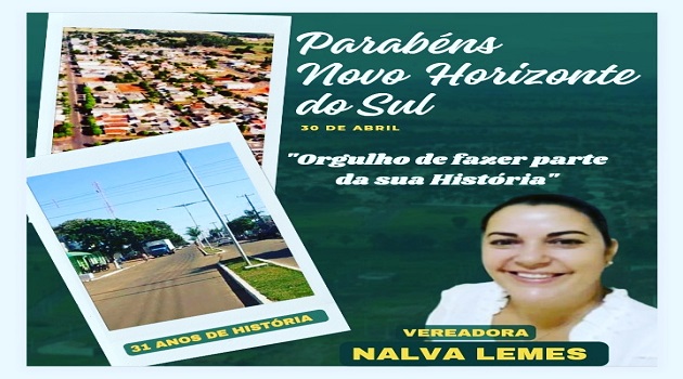 Novo Horizonte do Sul Vereadora Nalva parabeniza Novo Horizonte do Sul pelos 31 anos de Emancipação Politica 30 de abril de 2023 Redação Nhsnews Compartilhe