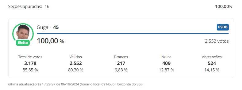 Aldenir Barbosa do Nascimento (PSDB), conhecido como Guga, foi reeleito prefeito de Novo Horizonte do Sul neste domingo (6) com 2.552 votos dos votos. Como única chapa registrada para a disputa, Guga, que tem como vice Giovane Donato dos Santos (PSD), foi confirmado para um novo mandato sem enfrentar concorrentes.
