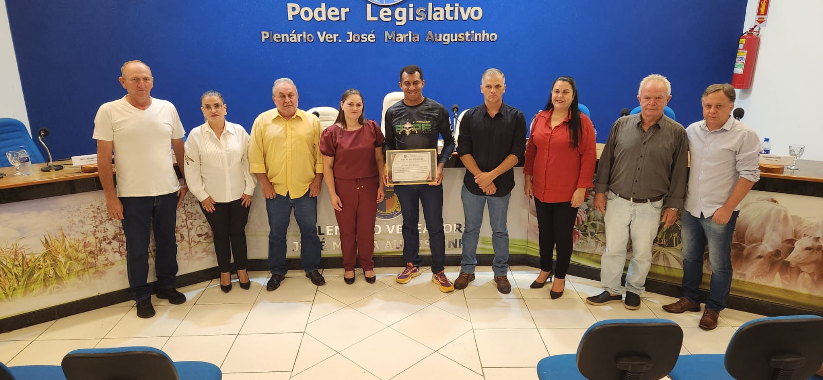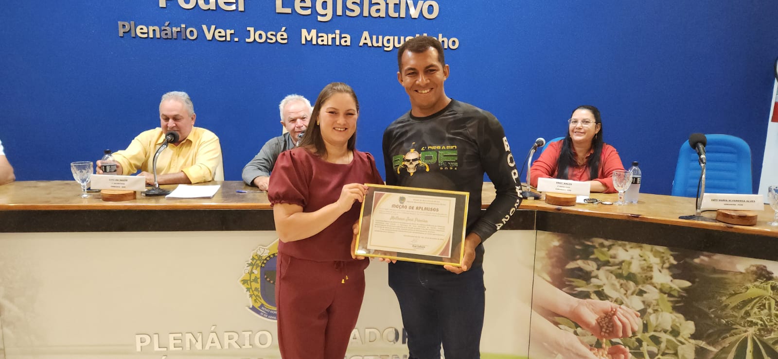 Após a leitura da moção em plenário, a Moção de Aplausos foi formalmente entregue a Mateus José Pereira, que recebeu os cumprimentos da vereadora Eva Gubert e dos demais vereadores pela sua excelente performance e contribuição ao esporte.