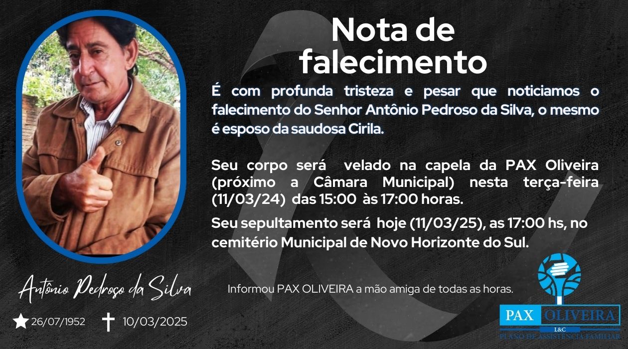 Novo Horizonte do Sul NOTA DE FALECIMENTO: Antônio Pedroso da Silva 11 de março de 2025 Redação Nhsnews Compartilhe